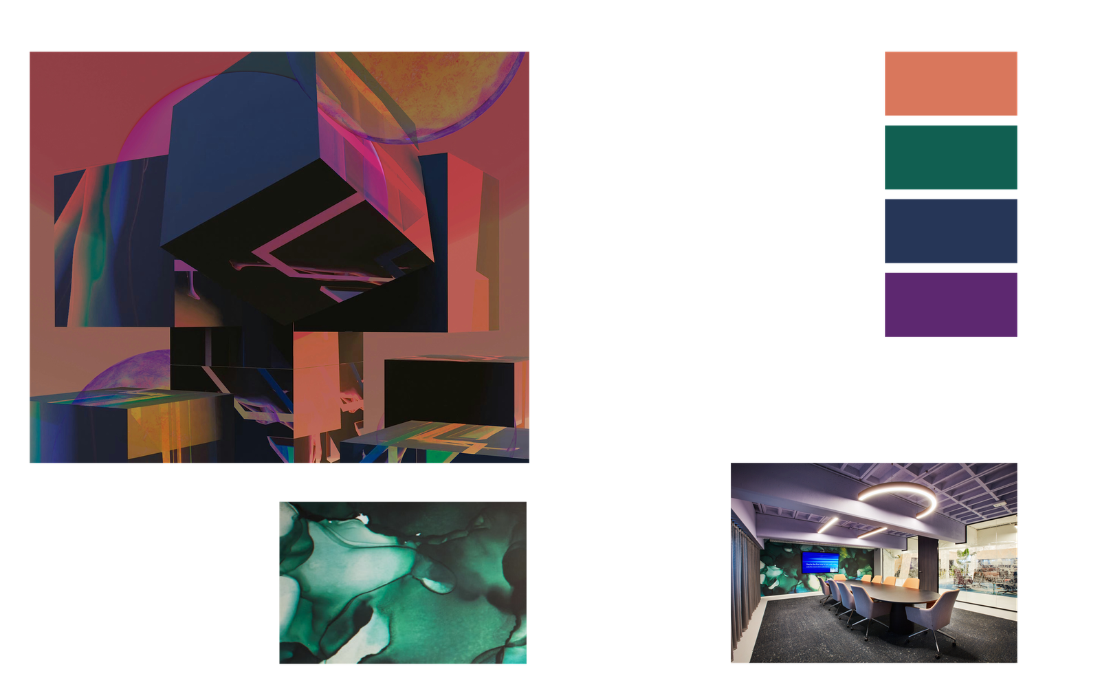 The building’s height allowed for the creation of a landscape with various flexible workspaces filled with greenery. Employees are free to choose their preferred spot. Additionally, a tiered seating area was added for presentations and brainstorming sessions, with phone booths underneath for quiet calls. The different zones create a dynamic environment fully focused on collaboration and innovation. Bright yellow accents and carefully chosen materials enhance the experience. At the heart of the space is the immersive room, where the latest technologies are showcased and experienced.