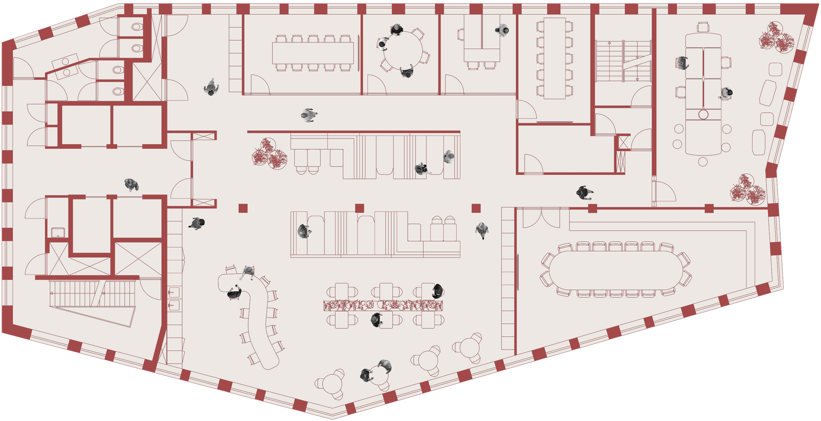 The office spans two floors with stunning views over Arnhem. It combines a dynamic meeting and collaboration floor with a quiet workspace. This setup strikes a balance between collaboration and focus, with flexible spaces like a training room and boardroom completing the workplace mix.