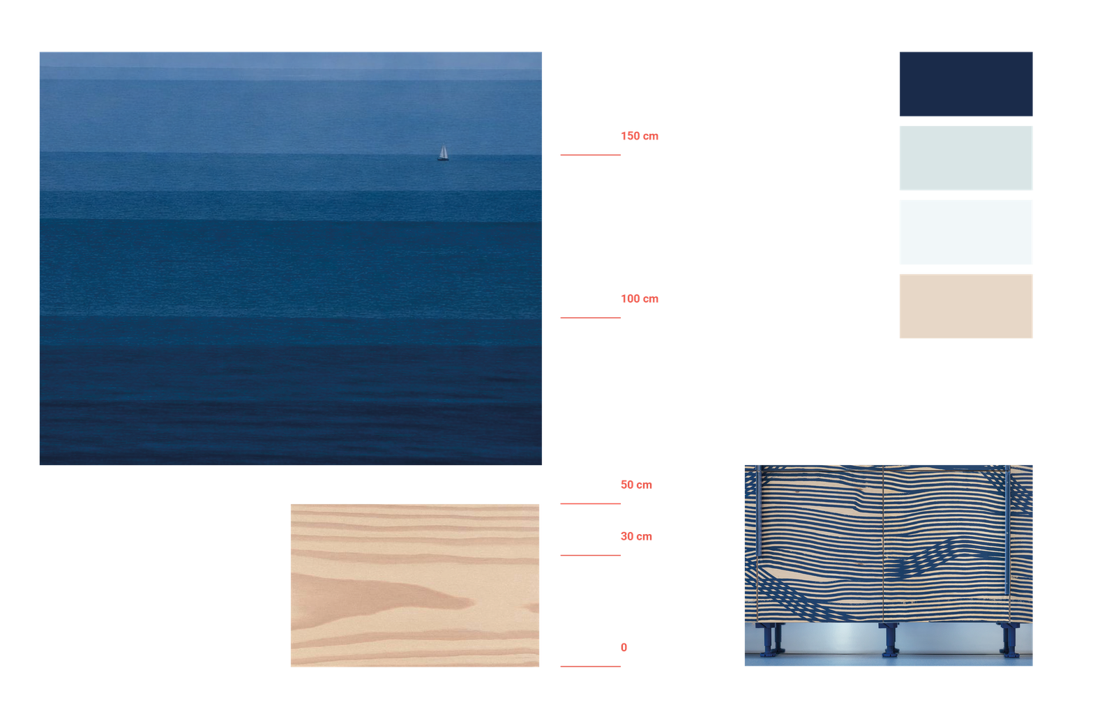 The choice of materials further reinforces this message. Carpet made from recycled fishing nets and signage on second-life Re-glow tiles by Studio Rens create a direct link with water and reuse. Functionality and meaning come together in one consistent material story, where every detail contributes to both the experience and the message of the space.