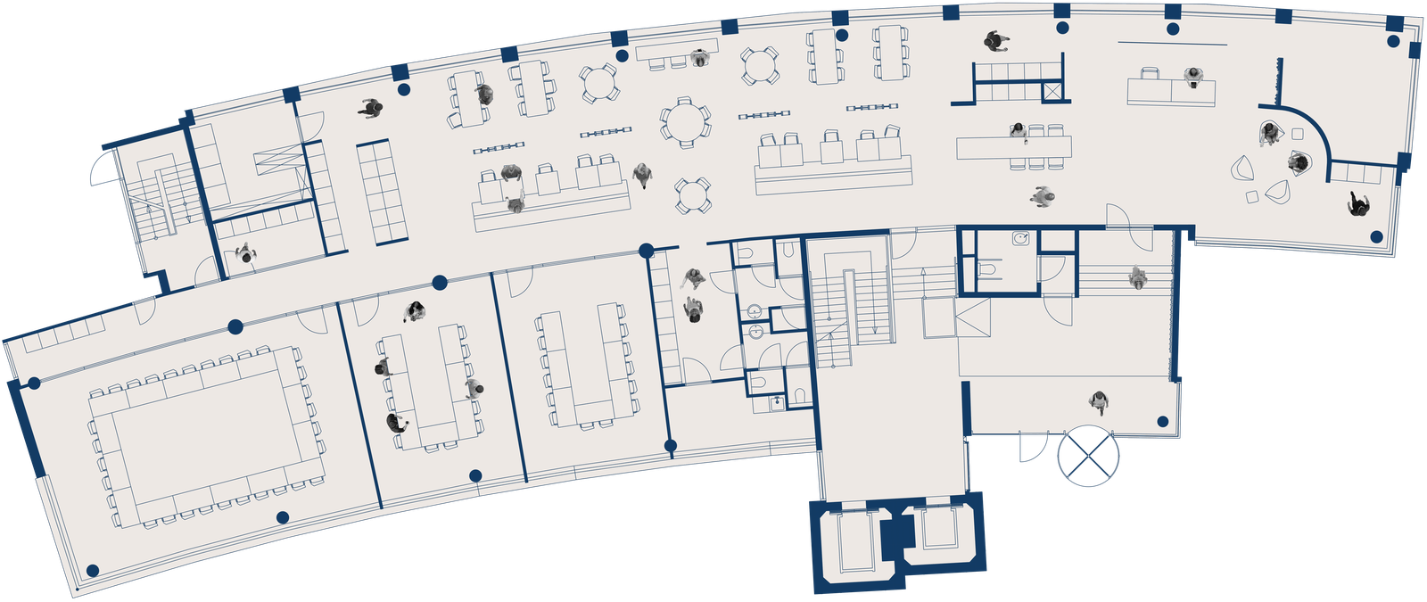 Tijdens de ontwerpfase werkten we nauw samen met ontwerpstudio Muurbloem, die een op maat gemaakte vloerbedekking met subtiele kleurverlopen ontwierp als visuele gids door het kantoor. Deze sluit naadloos aan op de bewegwijzering en functionele zones, wat een heldere, logische routing biedt. Het kantoor combineert een high-tech uitstraling met een warme, hotelachtige sfeer. Met een bedrijfsrestaurant, werkcafé en vergadercentrum biedt de ruimte een gastvrije en comfortabele omgeving waar medewerkers optimaal kunnen werken en ontspannen.
