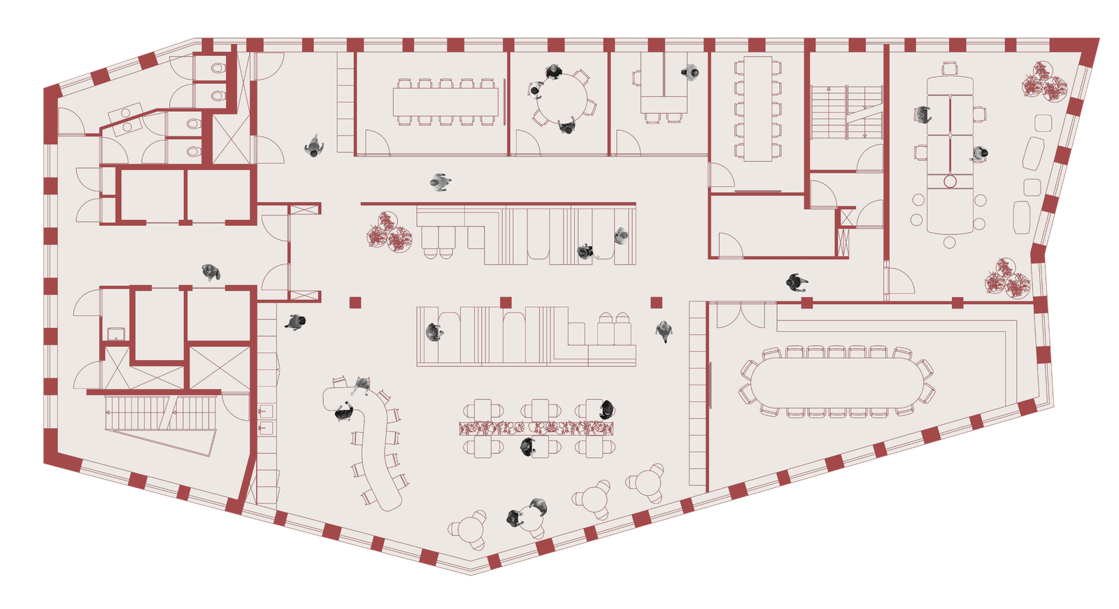 Meer dan 80% van het meubilair komt uit andere kantoren in Nederland. Sommige stukken kregen een nieuwe stoffering, andere konden direct worden hergebruikt. Nieuwe materialen werden geselecteerd op recyclebaarheid, gerecyclede content en een positieve impact op de luchtkwaliteit.