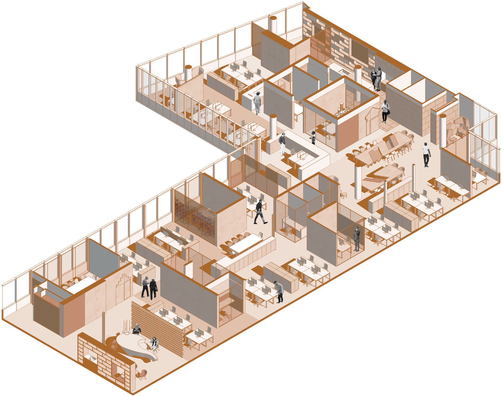 Een belangrijk aspect van het ontwerp was het samenbrengen van het hoofdkantoor en de Nederlandse vestiging in één ruimte. Het samenbrengen van twee entiteiten onder één dak vereist een goed begrip van zowel de voordelen als de uitdagingen. Om dit goed te laten werken, hebben we de teams geïnterviewd om hun behoeften en gedeelde waarden te begrijpen. Dit leidde tot een ontwerp met als centraal punt het ‘marktplein’. Deze ruimte stimuleert ontmoeting en vormt de overgang tussen de twee afdelingen.